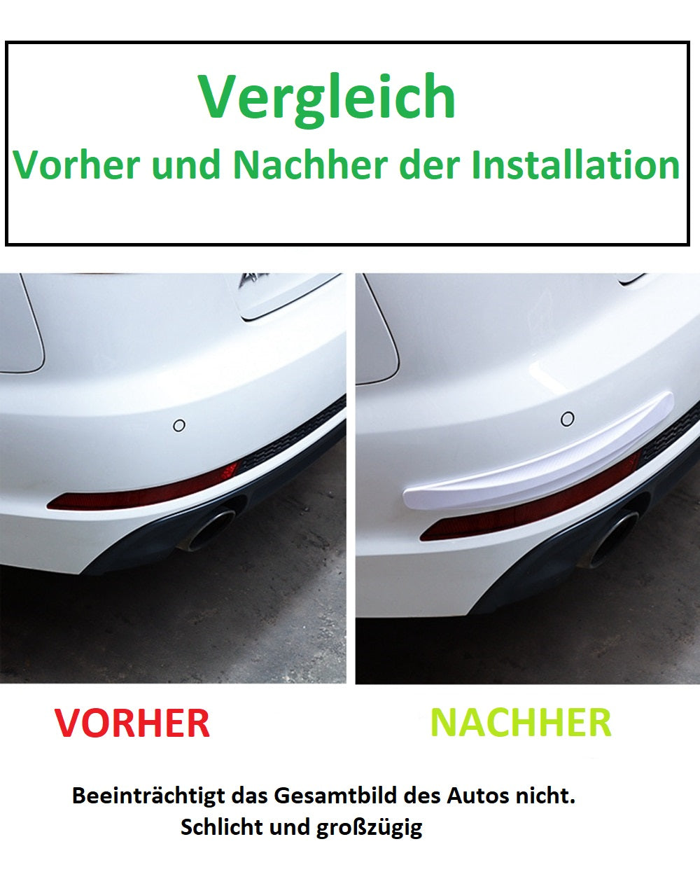Im Vergleich zu anderen Lösungen wie der Installation von Stoßstangen-Schutzleisten oder -bügeln, die möglicherweise die Optik des Fahrzeugs beeinträchtigen könnte, fügt sich die stoßstangenklebende Kollisionsschutz nahtlos in das Design Ihres Fahrzeugs ein. Die Vorrichtung ist in verschiedenen Farben und Ausführungen erhältlich, um perfekt zu Ihrem Fahrzeug zu passen und gleichzeitig seinen Stil und Look beizubehalten. Die stoßstangenklebende Kollisionsschutz ist auch äußerst einfach zu installieren. Sie benötigen kein Fachwissen oder besonderes Werkzeug, um sie anzubringen. Das bedeutet, dass Sie Zeit und Geld sparen können, indem Sie das Produkt selbst installieren.