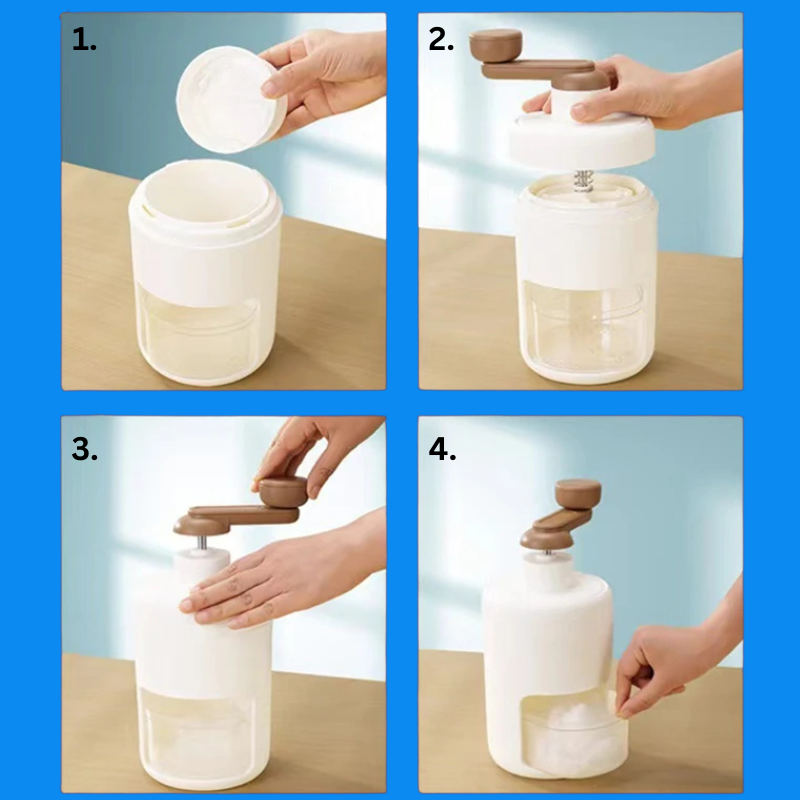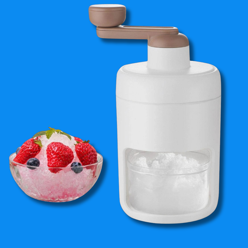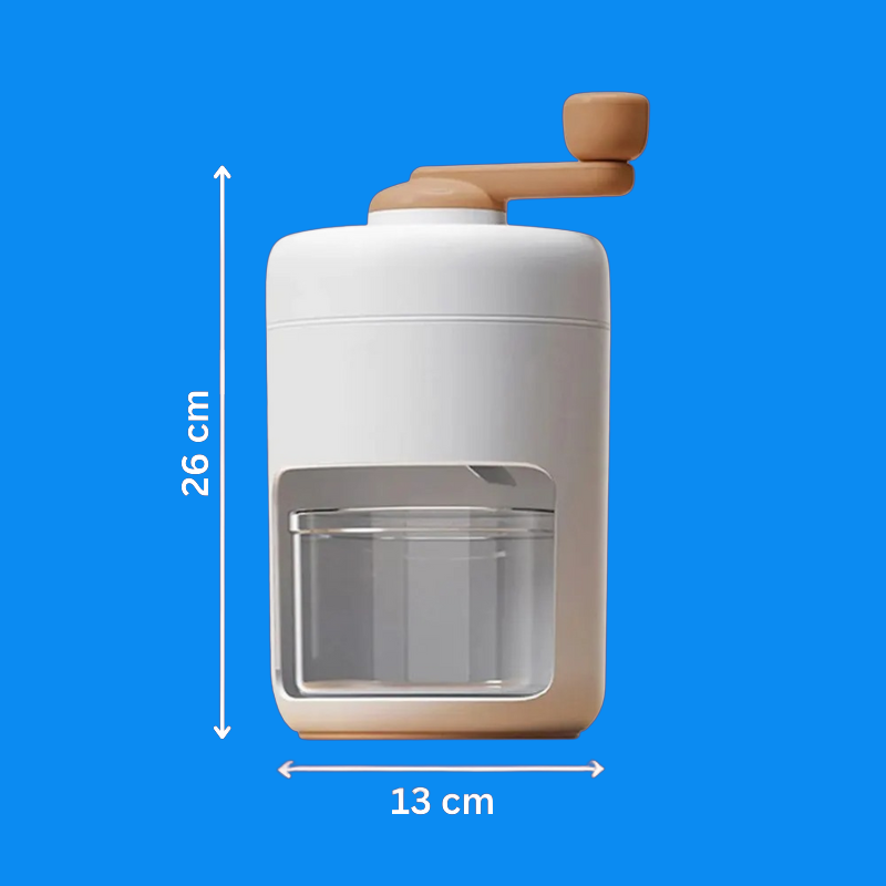 Die Bedienung ist ganz simpel. Fülle den Behälter mit Eis oder Zutaten, setze den Deckel auf und drehe die Kurbel, bis die gewünschte Konsistenz erreicht ist. Genieße dein Getränk und reinige ihn danach einfach.