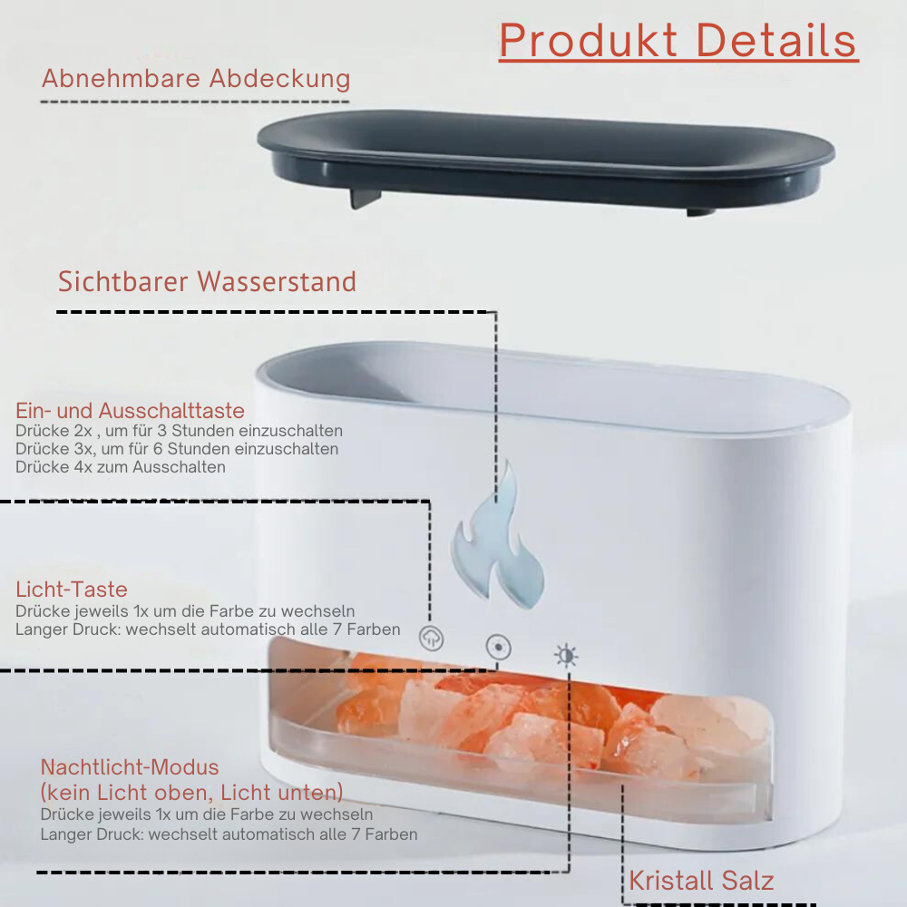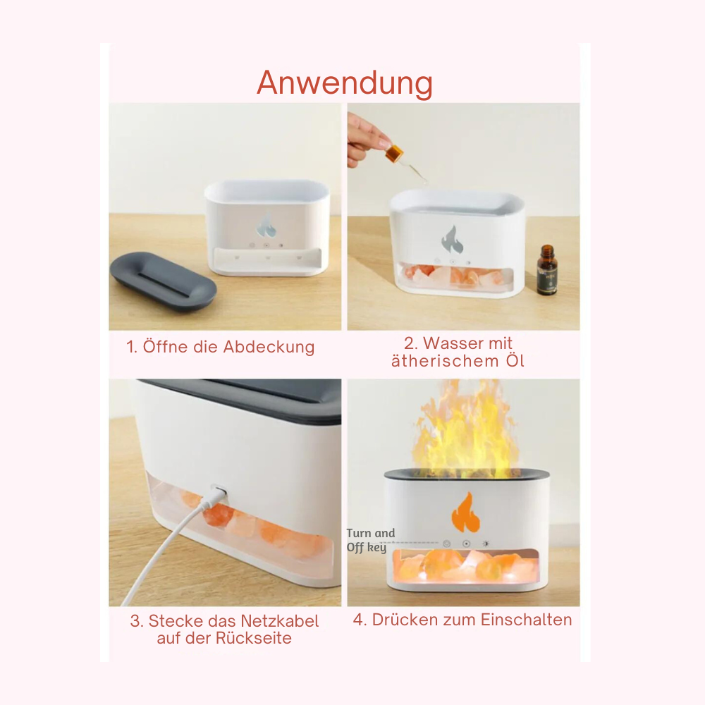 Die Bedienung ist ganz Simpel. Zuerst verteilst du die Steine im Unteren Behälter und montierst sie unten hinein. Danach öffnest du den oberen Deckel und füllst die Fläche mit Wasser und nun Startest du nachdem du den Deckel wieder in die Ursprüngliche Position verschlossen hast, den Luftfrischer an.